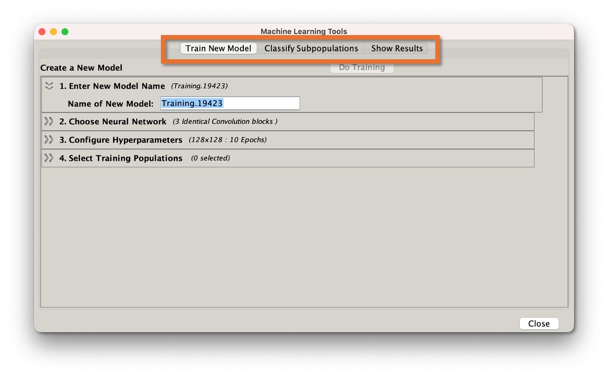 Clicking the icon reveals a dashboard with three tabs that can be used in sequence: Train New Model, Classify Subpopulations, and Show Results.