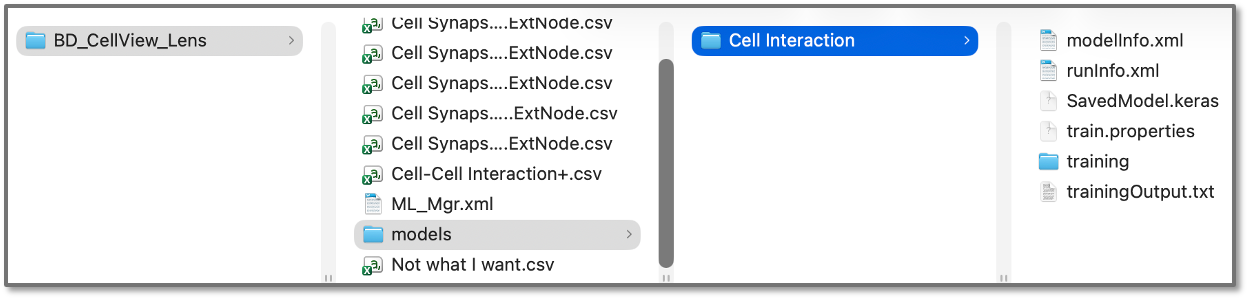 When you train a network, a model gets written into the {Workspace name}/BD CellView Lens/models folder. These are accessible within the workspace to be applied to any population and can be ported to other workspaces either by dragging the model folder into the folder of another workspace or using the Add Model button in the Classify tab. NOTE: To run a network on other data, the same parameters should be present.
