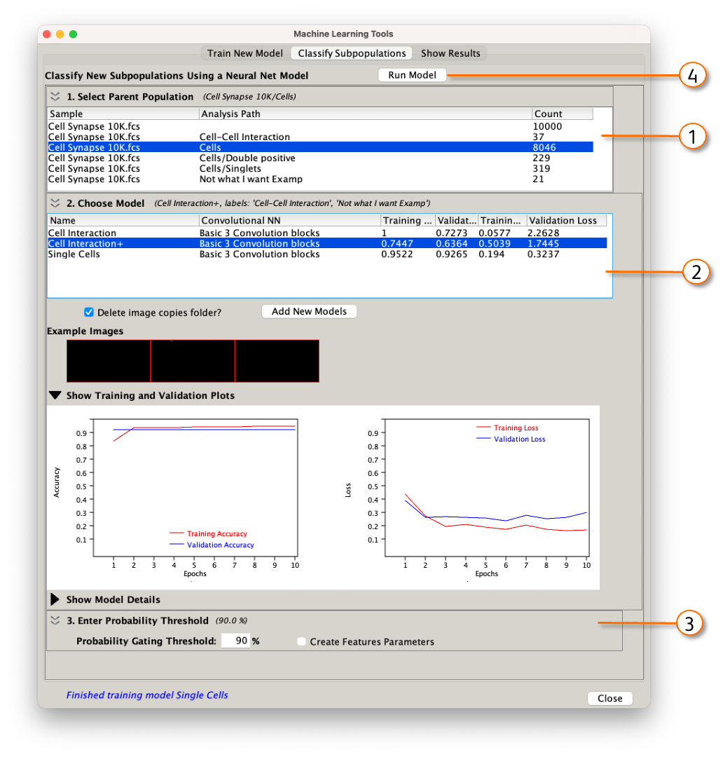 - Select the model that you would like to use. CNN, training accuracy and loss, and validation accuracy and loss are displayed for each model, and are available as graphs if the 'Show...' widget is expanded. Higher accuracy is better, and lower loss is better.