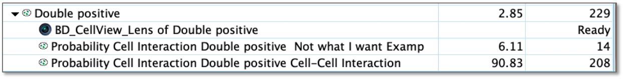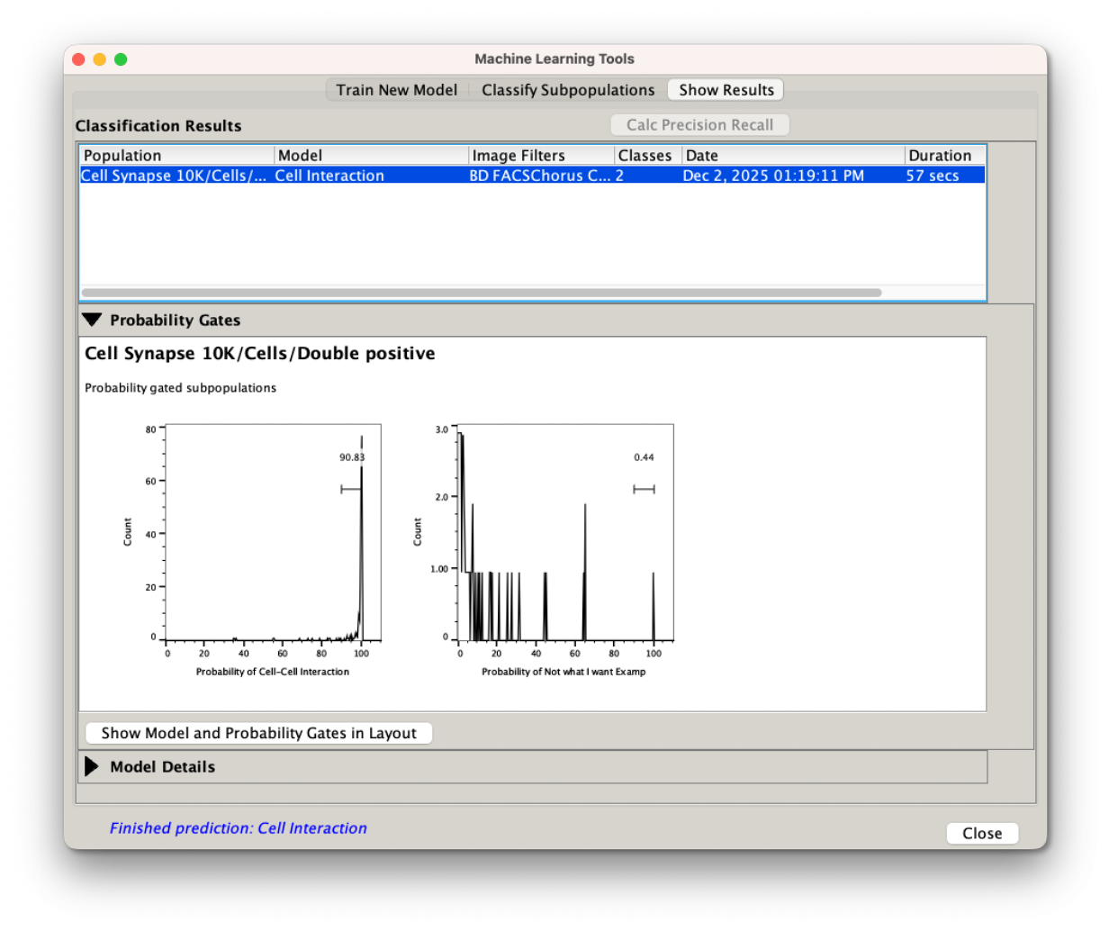 Additionally, the classification process produces two sub-populations from the population selected for classification, one matching each example population. They will be named 'Probability' {model name} {population to be classified} {example population name}. This name is information rich but lengthy, and you may use the rename function (Ctrl or Cmd + R) to create more succinct names. In this example we have used a CNN to hunt through our population of cells positive for both B and T cell markers and find the pairs that were near each other and found that 90% of this small population were touching.
