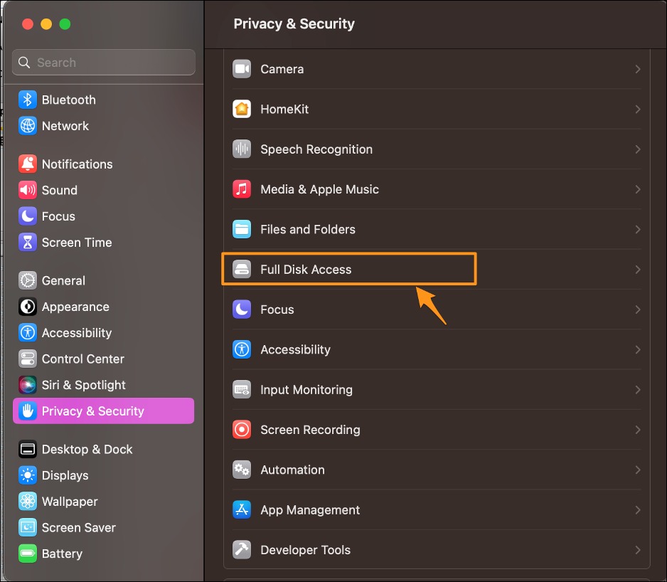 2. On the right panel, under Privacy & Security, select Full Disk Access