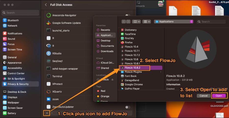 Below are instructions for granting “Full Disk Access” to FlowJo on MacOS’s Ventura and newer for proper Dongle detection.