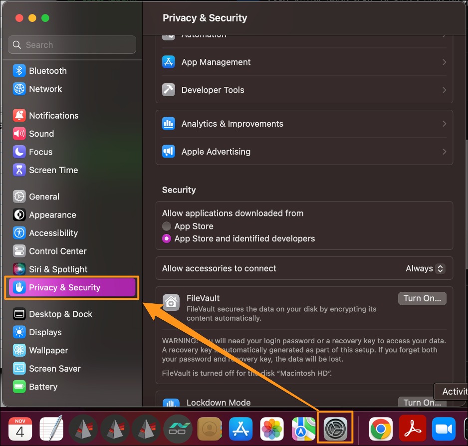1. Open up your MacOS System Settings (Apple icon -> System Setting) and select Privacy & Security from the list on the left-hand panel