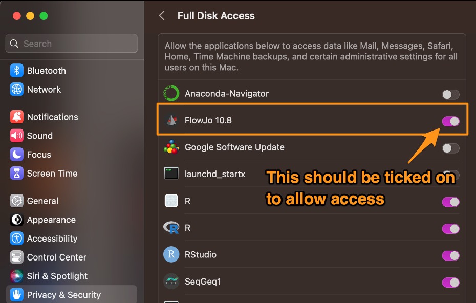 Once installed, please make sure to provide FlowJo with the “Full Disk Access” permissions shown below. Please note, on MacOS Ventura, you may also have additional accessory permissions that need to be granted but not all MacOS’s on Ventura have these accessory security options.