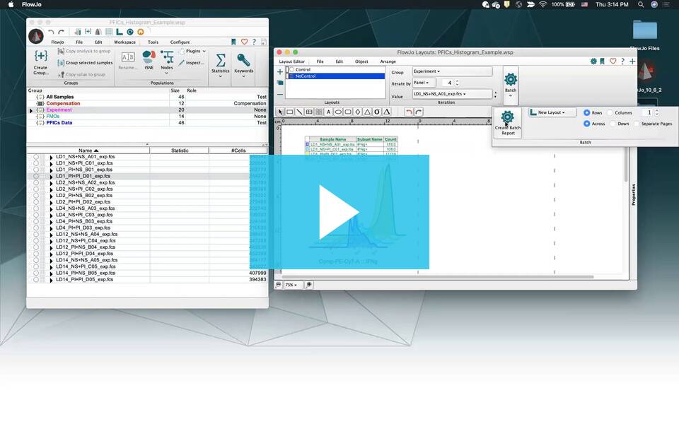 Other times, reports are created where each frame contains data from more than one tube. Examples of multi-sample reports could be several tissues from a common animal, multiple doses of a common drug, or cross patient studies using blood collected over time. In cases such as these, it is not enough to simply process successive tubes in a batch report. More sophisticated organization is required. Iterate by Panel is the easiest method of iterating. If you want to overlay two tubes and batch process the layout so that tube 2 is overlayed on tube 1 and then tube 4 overlays tube 3 etc. choose Number of Tubes in each Panel = 2. For more complex iteration, choose a Keyword value for the iteration variable. The popup menu of iteration types lists all the keywords found in all of the samples of the current group. Select the keyword that you want in common in all frames of your layout. The value will vary in each of the frames. By selecting a different group in the workspace, or by selecting a custom group from the Batch dialog, you can change the set of samples to be processed in the batch. For example, if you set the Iteration Type attribute to be the keyword $Cells, where you have a Patient ID entered into the $Cells keyword, then FlowJo will examine all of the tubes in the current workspace, and generate a list of the unique values of $Cells. These are then displayed in the Layout editor in the popup menu just below the Batch button. By selecting any of these values from this menu, FlowJo will change the current layout view to show graphs and statistics drawn only from tubes with that value of the Iterator. By setting this popup menu to Off, you are telling FlowJo to use all of the original graphs that you dragged and dropped into the layou). This is the way in which you can build reports which select graphs and statistics from different tubes and put them all on the same page.