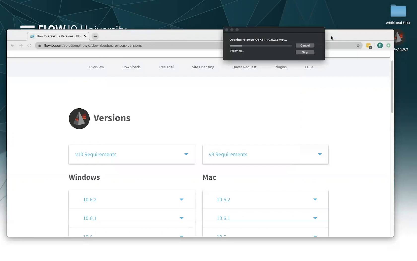 Download the installer.exe file and double click on it to install the program. Simply press the “Next” button to agree to the default settings in the FlowJo installation. Choose to place a shortcut on the desktop, and when the installer finishes double-click on the FlowJo shortcut icon to launch the program.