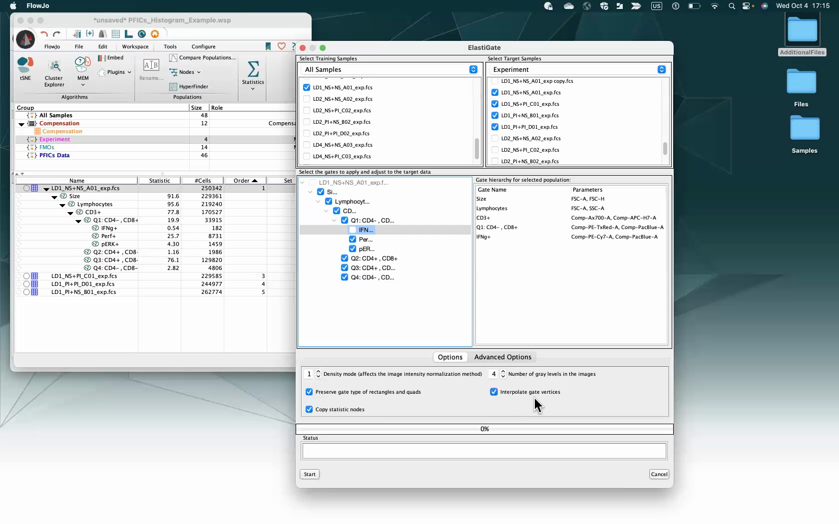 • Once all options have been set, click the “Start” Button. Once ElastiGate is done, you can close the ElastiGate window. The selected gates will be created on the selected target files in your FlowJo workspace. They are equivalent to manually drawn gates and may be moved and adjusted by hand.