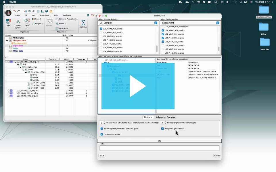 The purpose of this plugin is to copy gates from one or more training files and adjust them to one or more target files. To use this plugin, you must have one or more fcs files in the FlowJo workspace gated with the same gating strategy, to be used as training files, and one or more fcs files in the FlowJo workspace which have the parameters that the gating strategy is defined on, to be used as target files. It does not matter if there are gates already on them.