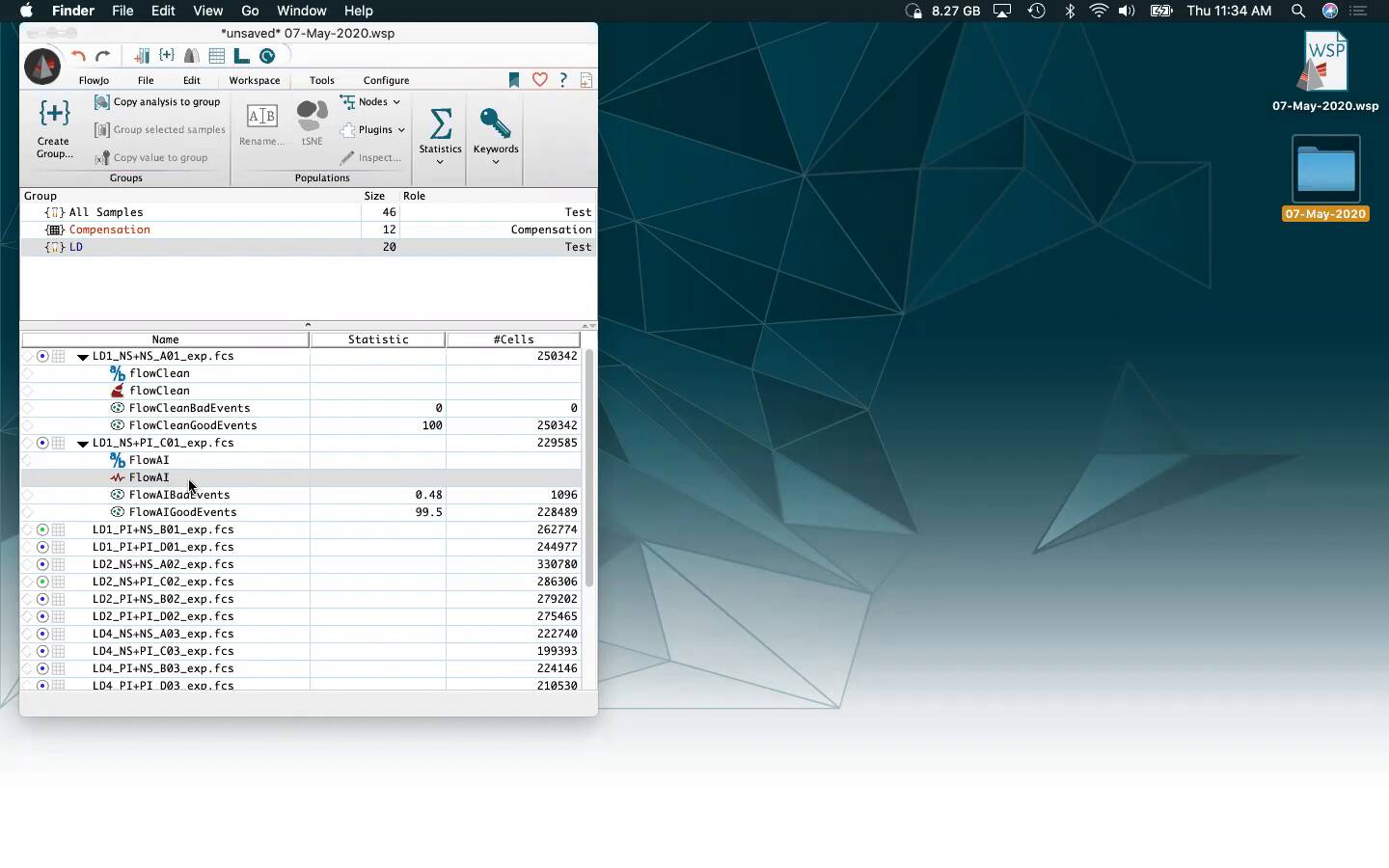 4. After running the plugin on your data, a new derived parameter and a set of GoodEvents/BadEvents populations will be created. The flowAI population can be compared with the raw population’s Time parameter in order to view the clean-up performed: