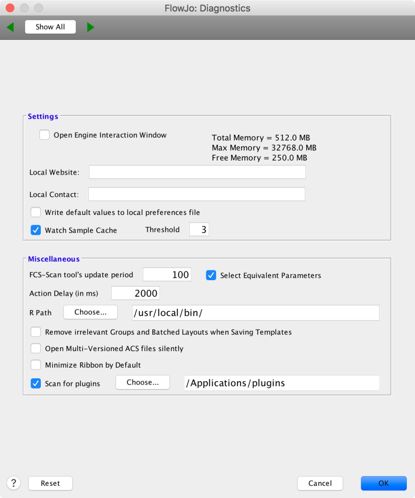 Scan for Plugins: If this option is selected FlowJo will search the default plugin path location for its plugins. The plugin path can also be entered manually in the blank box or it can be manually selected by searching for the plugins folder with the “choose” button.