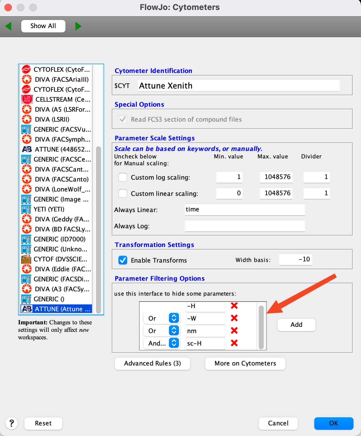 The Attune Xenith was recently released and we have not updated FlowJo v10 to include default scaling preferences. For the best user experience, open the FlowJo Cytometer preferences and edit the defaults to match the recommendations below.