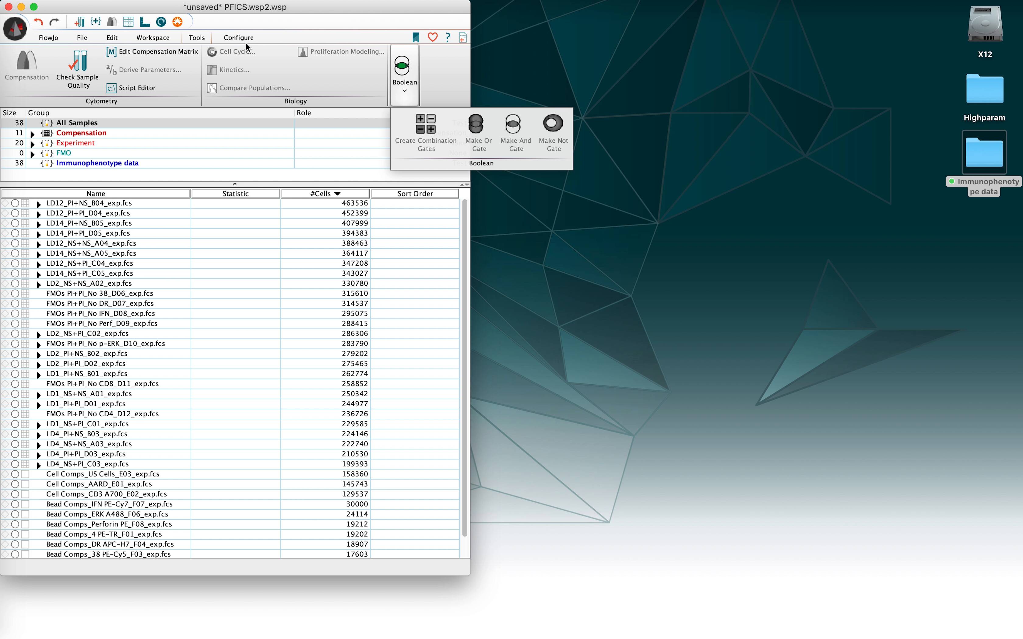 - These are presented below each sample in a hierarchical scheme. Gates and statistics can be dropped on other samples or groups of samples.