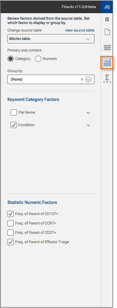 This tool allows you to quickly reformat the chart to include any categorical data included in the original table used to generate the chart.In the example below, a menu with the values of Condition expanded via the carrot on the right side of the menu is shown (Figure 4). Checking off any one value of a category removes it from a table, checking an entire factor off removes all values from the chart. Selecting more than one categorical factor creates all Boolean combinations of those factors in your chart.