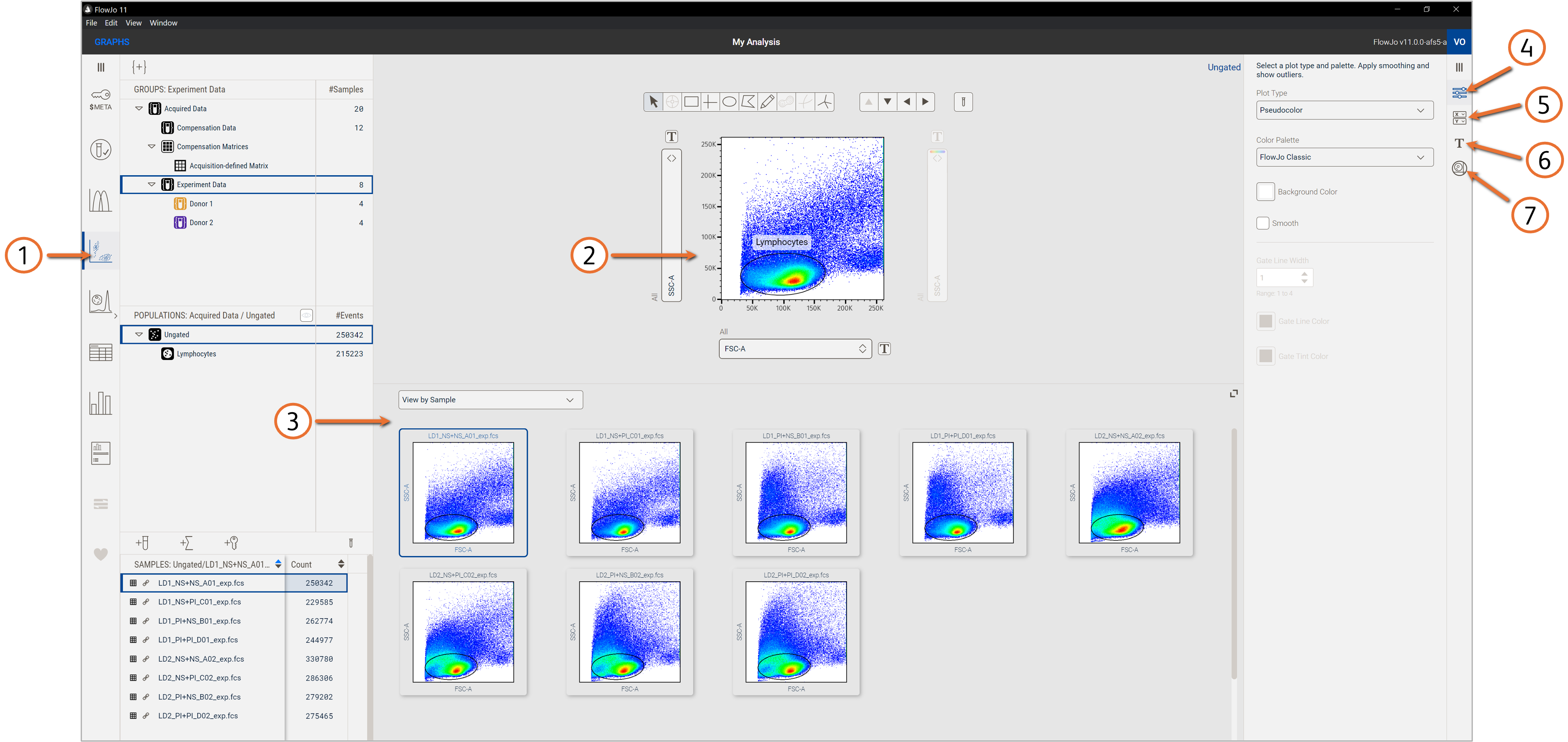 Gates subset events into populations based on marker expression. Drawing gates within gated events builds a population hierarchy or ancestry, where one can have child, parent, and grandparent gates. This is a key part of flow cytometry analysis because it allows us to focus our investigations on phenotypes of interest. The Graphs context (Figure 1) has various features to not only draw gates but also visualize your data in different ways to guide analysis.