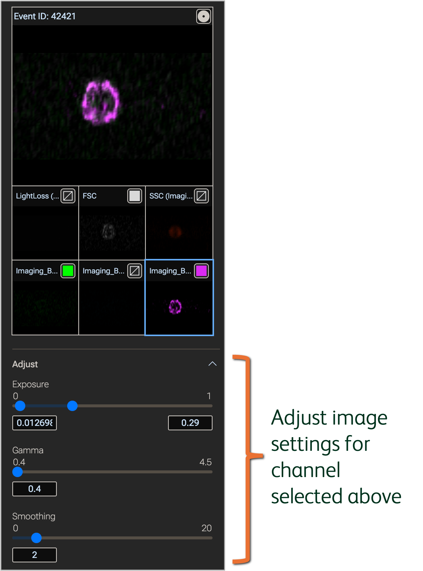 Modify image settings by clicking the single channel to be adjusted; the tile of the channel being modified will be outlined in a different color (Figure 5). Use the sliders to adjust the following settings.