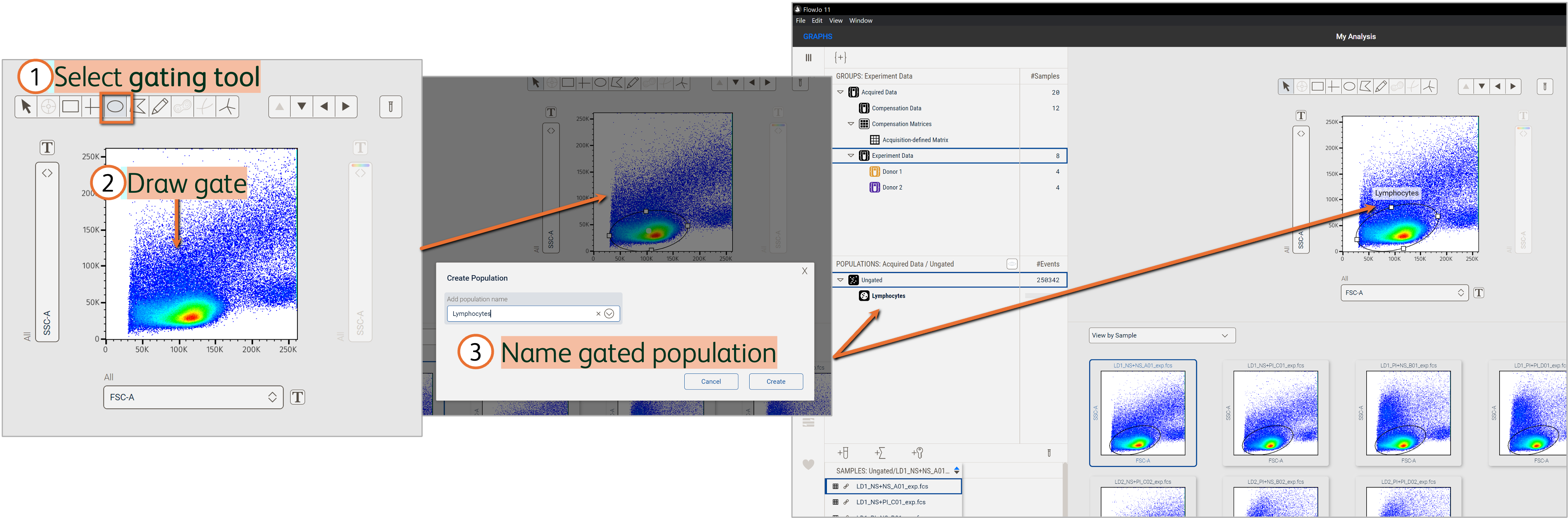 After selecting a sample and gating a tool (Figure 5.1), click inside the plot and draw the gate with a click-and-drag of the mouse (Figure 5.2). Once the gate is set, a prompt to name the population will appear and it will be added to the group’s hierarchy in the Population panel (Figure 5.3). For quadrant gates, each quadrant population will be automatically named using the parameters displayed on the axes, but populations can be renamed (see next section). The gate will be automatically applied to all samples in the selected group. In the example below, the analysis was started with a simple ellipse gate to clear debris called Lymphocytes.