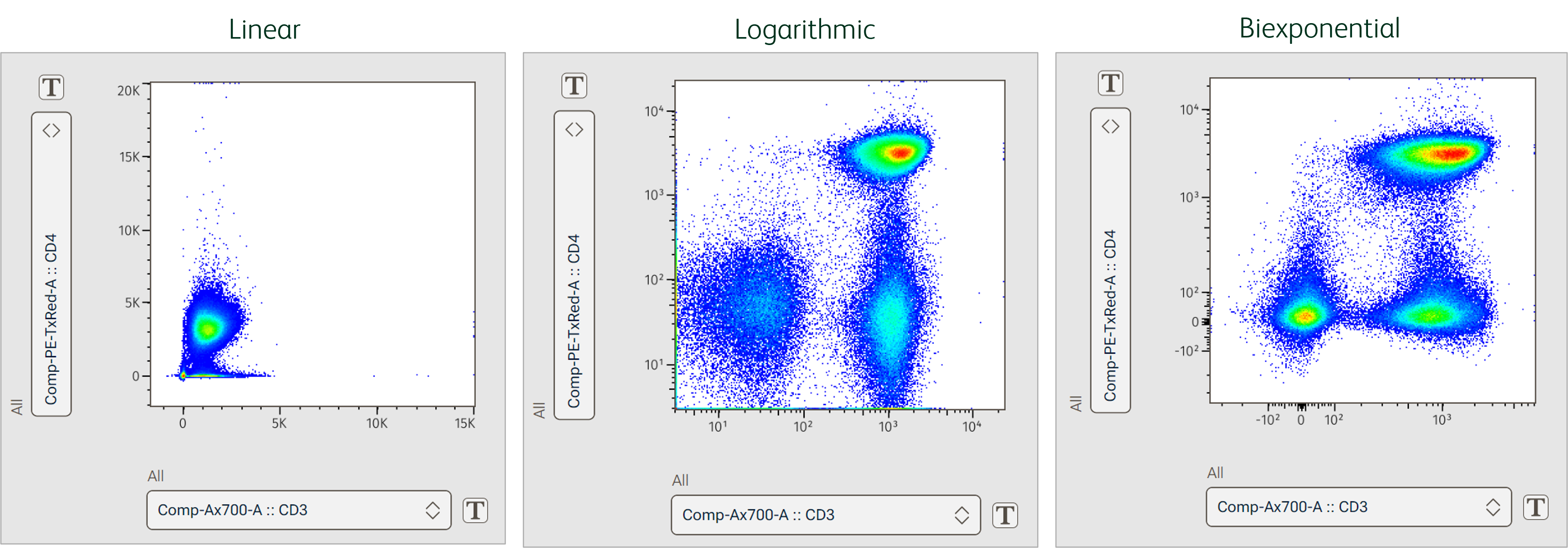 • Log: Data is scaled by base 10 log to better visualize a large range of values. Log scaling may be appropriate for data with a large range of values or collected on an analog cytometer. Because we cannot take the log of a negative number, this transform cannot accommodate negative data values, which are possible with modern digital cytometers. As such, hyperbolic functions that handle both negative values and large dynamic range are favored for scaling flow cytometry data.
