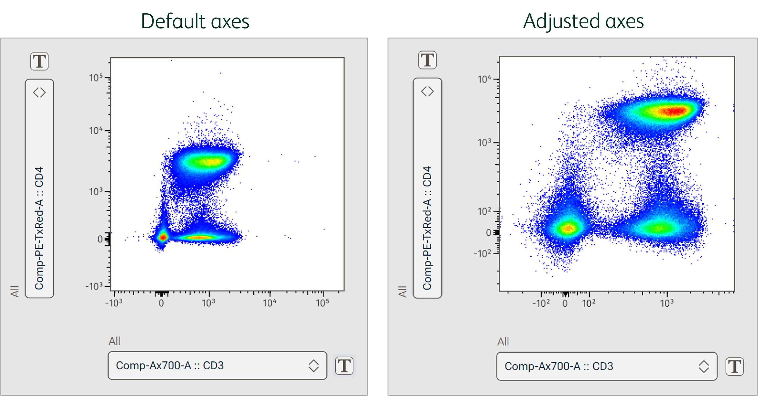 In the example below, default Biex scaling of the CD3 and CD4 parameters made the populations appear compressed (Figure 3). Decreasing the maximum value on the axis by 1 log for both parameters, and adjusting the positive and negative decade space expanded the space occupied by the high value data, making populations appear much more distinct in the resultant plot.