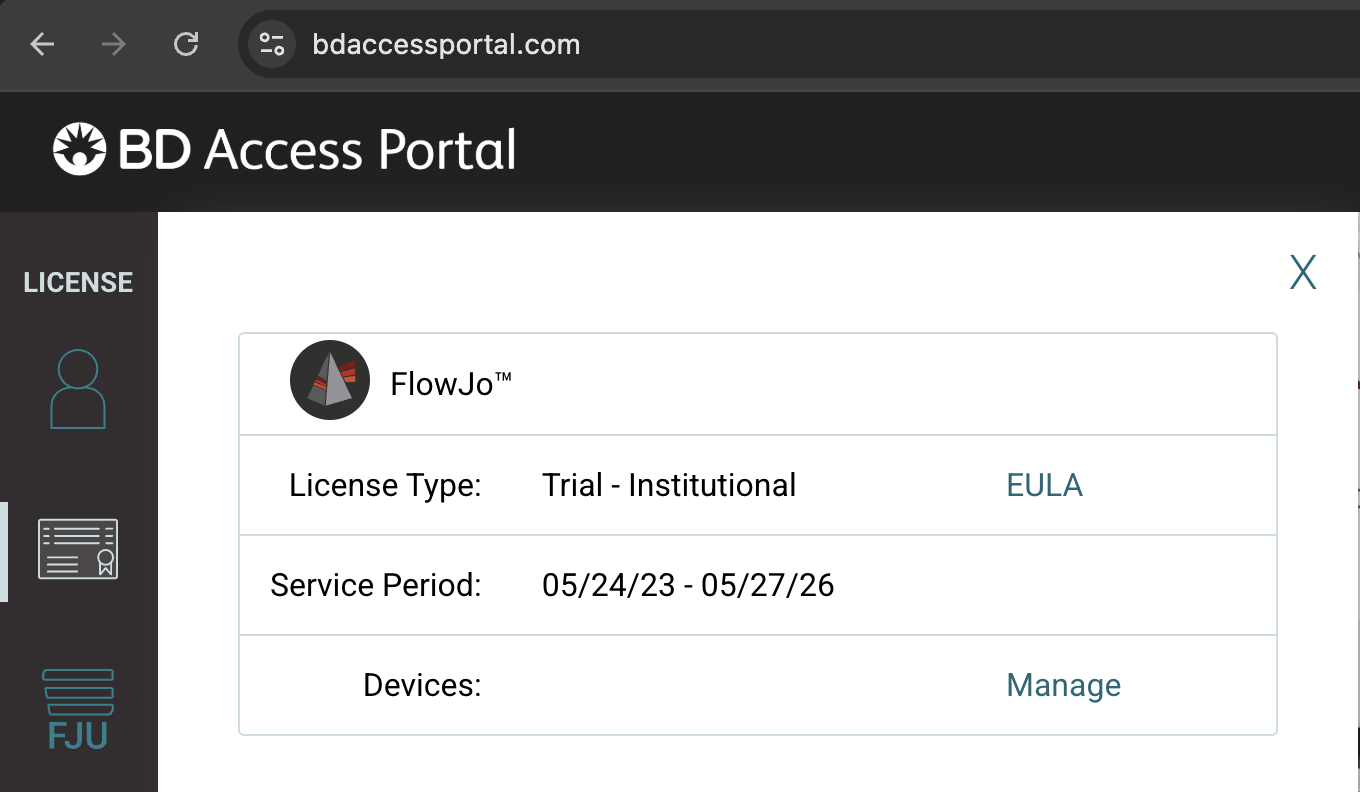 Use your portal email address and password to login to the BD Access Portal webpage (https://bdaccessportal.com/). Select the"License" icon on the lefthand side bar of the webpage. Clicking on the "License" icon will open a pane that lists the licenses associated with the portal account. Select "Manage" in the "Devices:" section for the FlowJo™ license.
