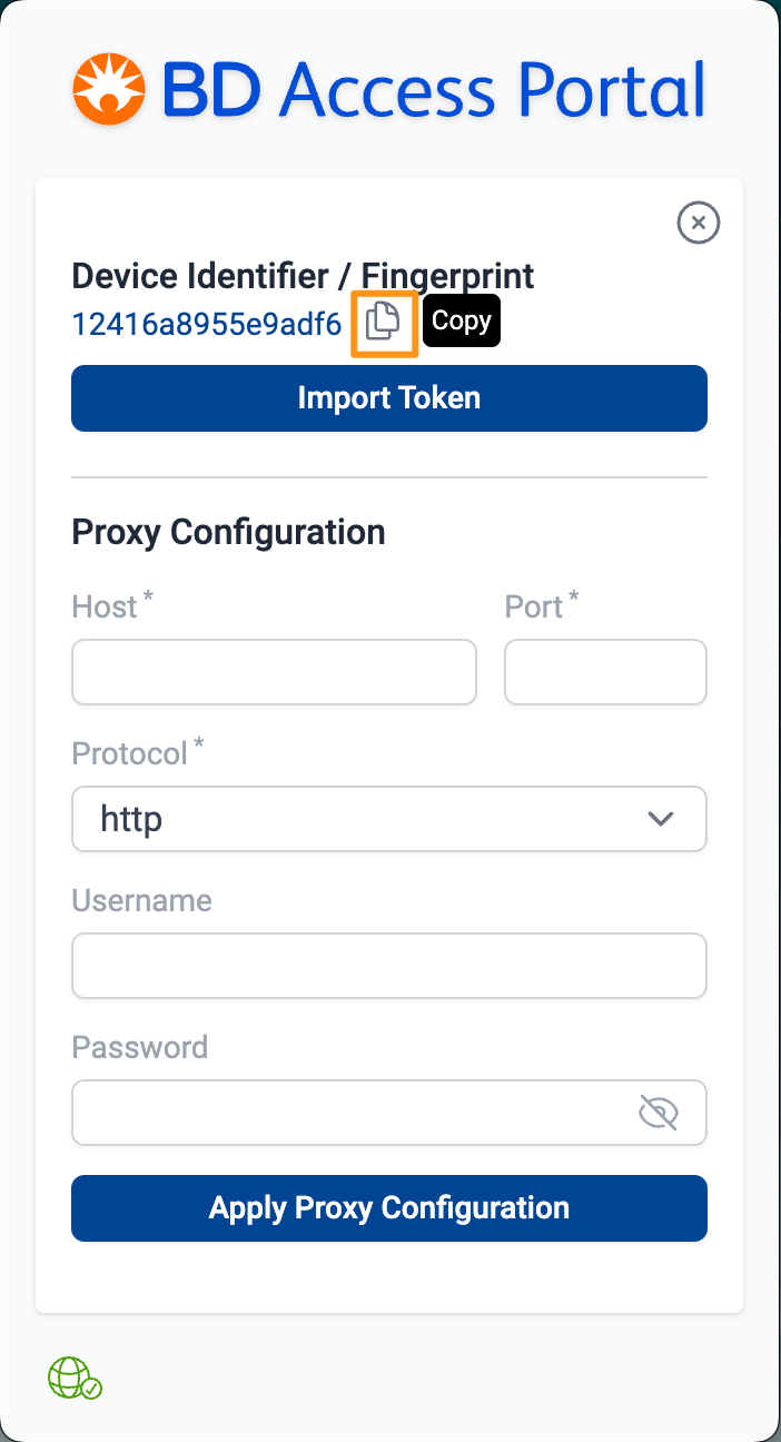 Each computer device is recognized by a unique device identifier (aka fingerprint). To find the device identifier for your computer, open BD Access Portal application and:
