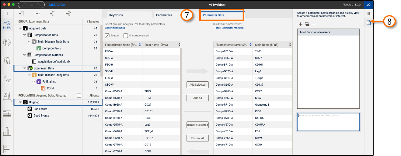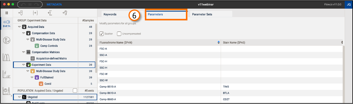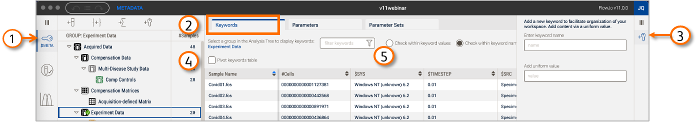 Additional annotation, outside of that added by the cytometer, can improve organization, ordering, and iteration during your analysis in FlowJoTM. To add additional keywords, follow the instructions in your acquisition software or do it post-acquisition with FlowJoTM’s Metadata context (Figure 1). Use this interface to also modify and organize parameters.