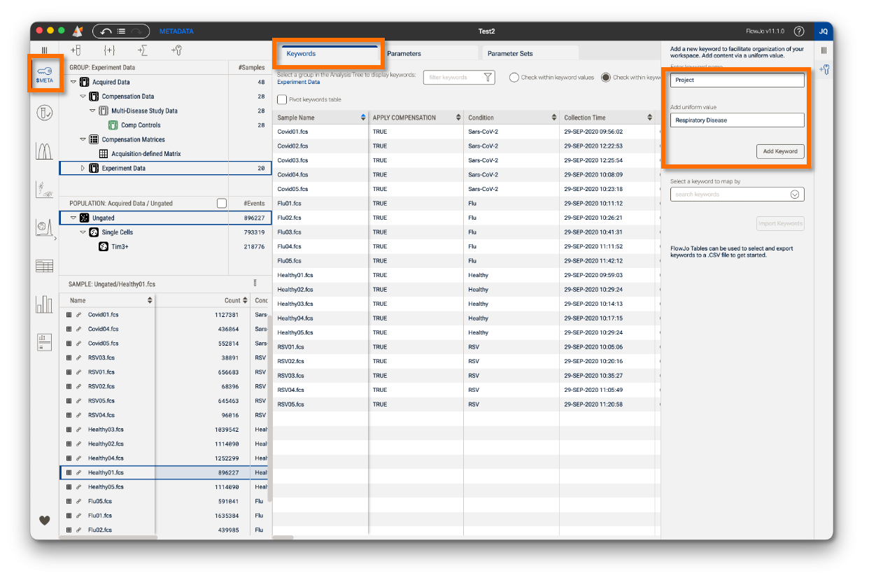 Meta-data, information about the data, can be added to your FCS (Flow Cytometric Standard) files either at the time of collection using the acquisition software or post-acquisition in FlowJoTM. All cytometers will automatically set minimal information through the use of keywords, which are short strings of text added to the header of FCS files identified by letter codes. The MetaData Manager, keyword tab, can be used to view, filter, or add additional keywords in FlowJoTM post-acquisition.
