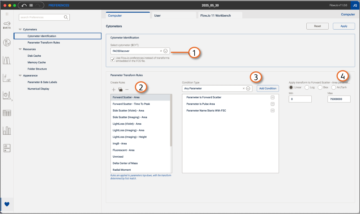 Observe in Figure 1 that the upper section of the window, marked with callout 1, is for cytometer identification. FlowJo will use the $CYT (cytometer) keyword to determine which preference to apply. You can select any cytometer from the list to define those preferences. Note that there is also an option to identify whether to use the scaling in the FCS file, or the FlowJo preferences when they are in conflict.