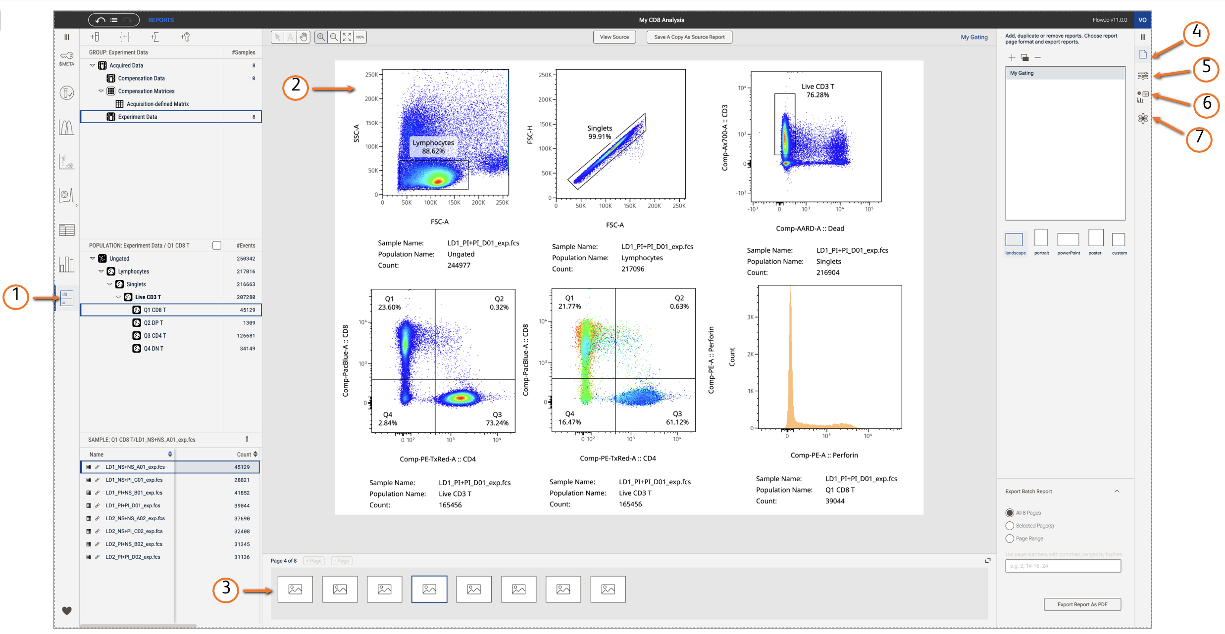 Export a single report or batched report out of FlowJoTM in the Properties panel. Reports export is now limited to pdf format. Popular formats that include jpg, svg and tiff will come soon!